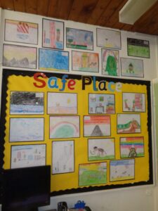 With that in mind, in school, the pupils have been thinking about and drawing pictures of their ‘Safe Spaces’. Their Safe Spaces are places that they feel safe. There have been some wonderful examples including: ‘in school’, ‘in my bed with my dog’, ‘outside in my back garden’ and ‘in my room playing with my cat’. This exercise reminds each pupil of the importance of feeling safe. We use the drawings as a classroom prompt to help each pupil to self-sooth in supportive environment so that they can re-engage into the the learning environment.