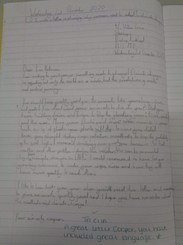 Farming in the UK – This half term in Geography, we have been focussing on how different crops are grown in the UK. The children looked at how climate change affects both arable and pastoral farming. The children wrote a letter to a local farmer to inform them of ways in which they can adapt their strategies and techniques. They came up with some great ideas and used excellent geographical language.