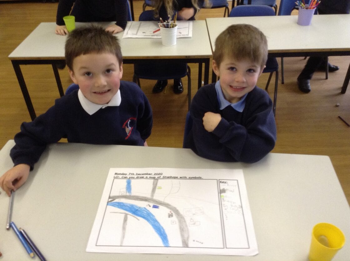 What is it like where we live (Stanhope)? – While we have not been able to explore the local area in person, we have used the internet and photographs to find out about where we live. The children have developed their map-making skills, using symbols and keys to draw maps of the school and Stanhope itself.