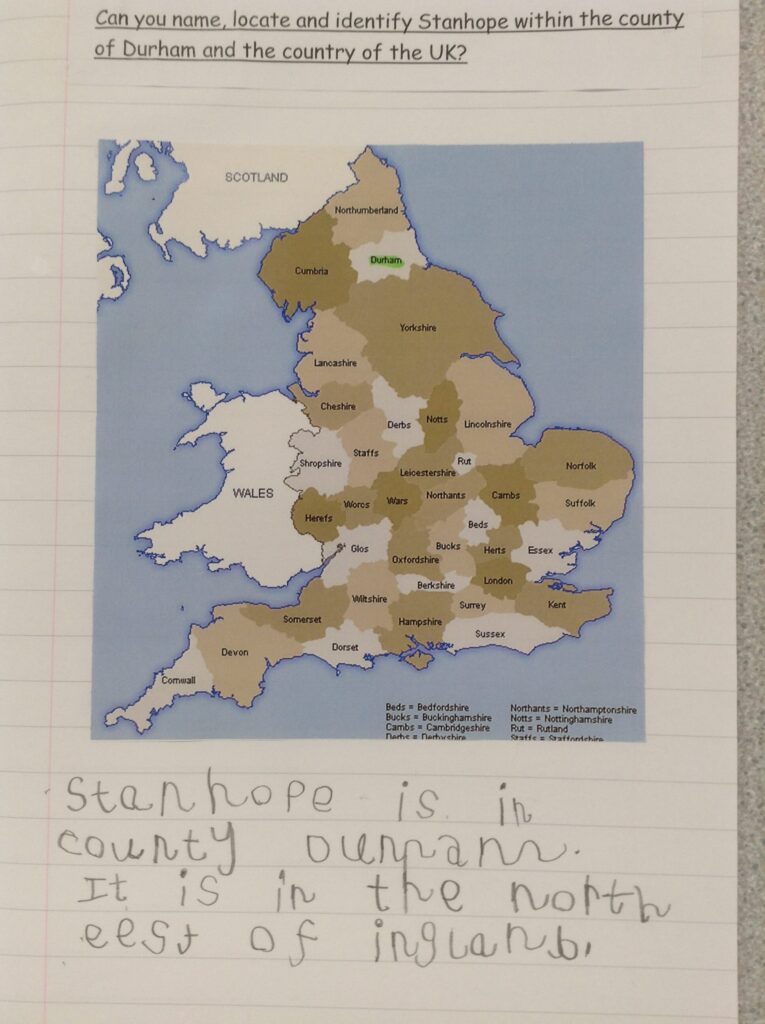 What is it like to live in Stanhope? – This half-term we have had a deep-dive into our local community as we unpicked Stanhope. Using a range of skills, the children were challenged to use maps to identify key features in our local environment. All of the children showed fantastic progress with their finding skills and we even created a route that we were to follow on our educational walk. After showing a good understanding of the town we ventured onto County Durham and attempted to locate it on a map of the United Kingdom.