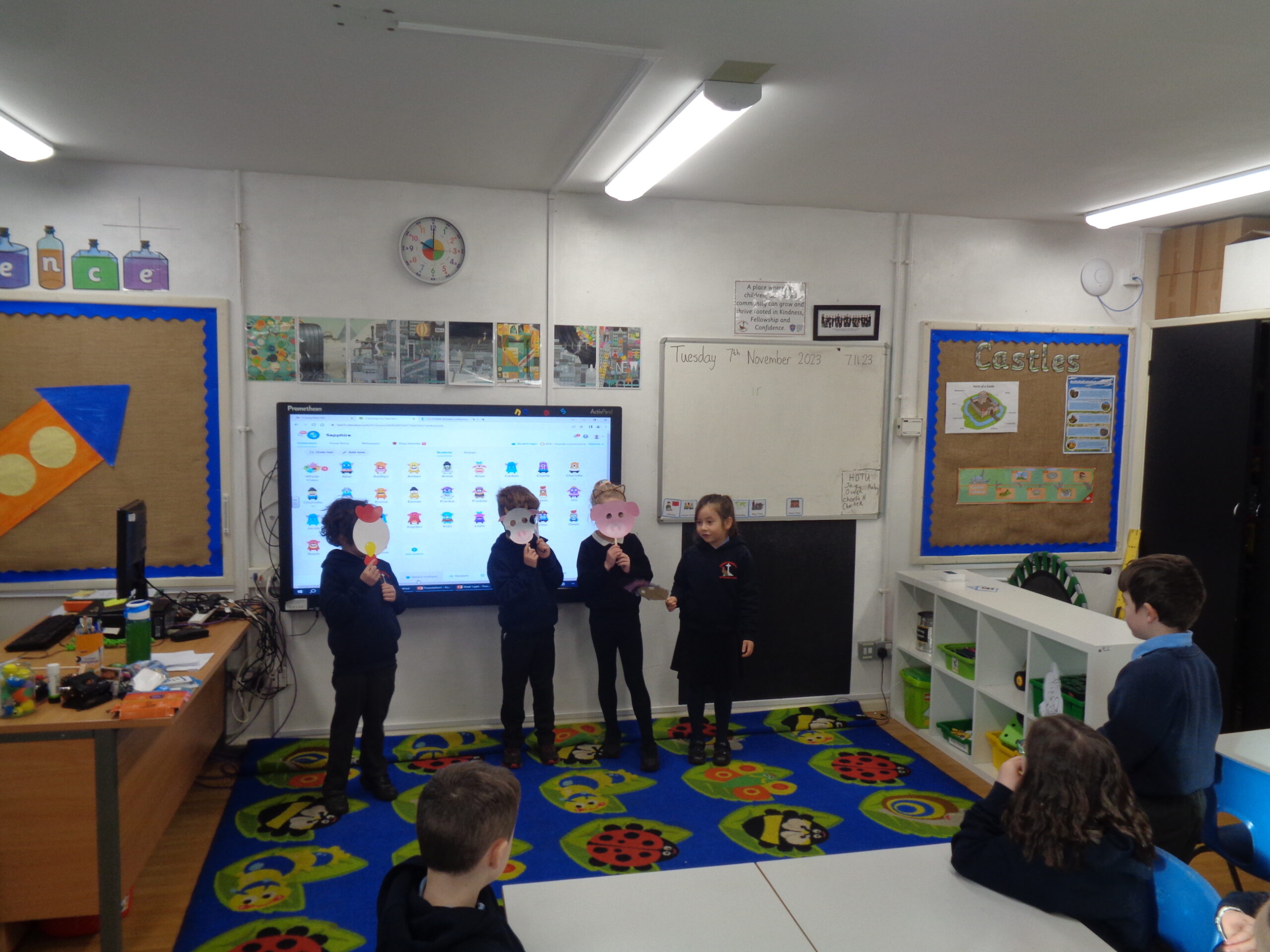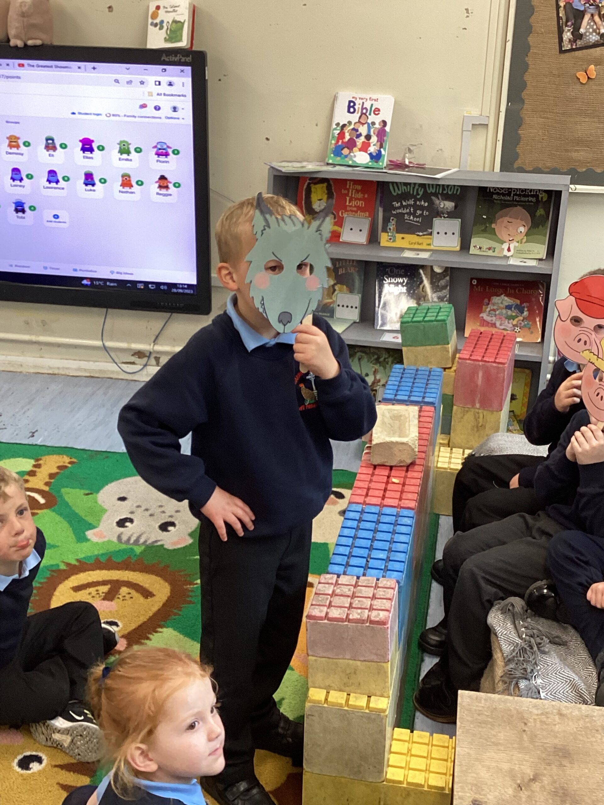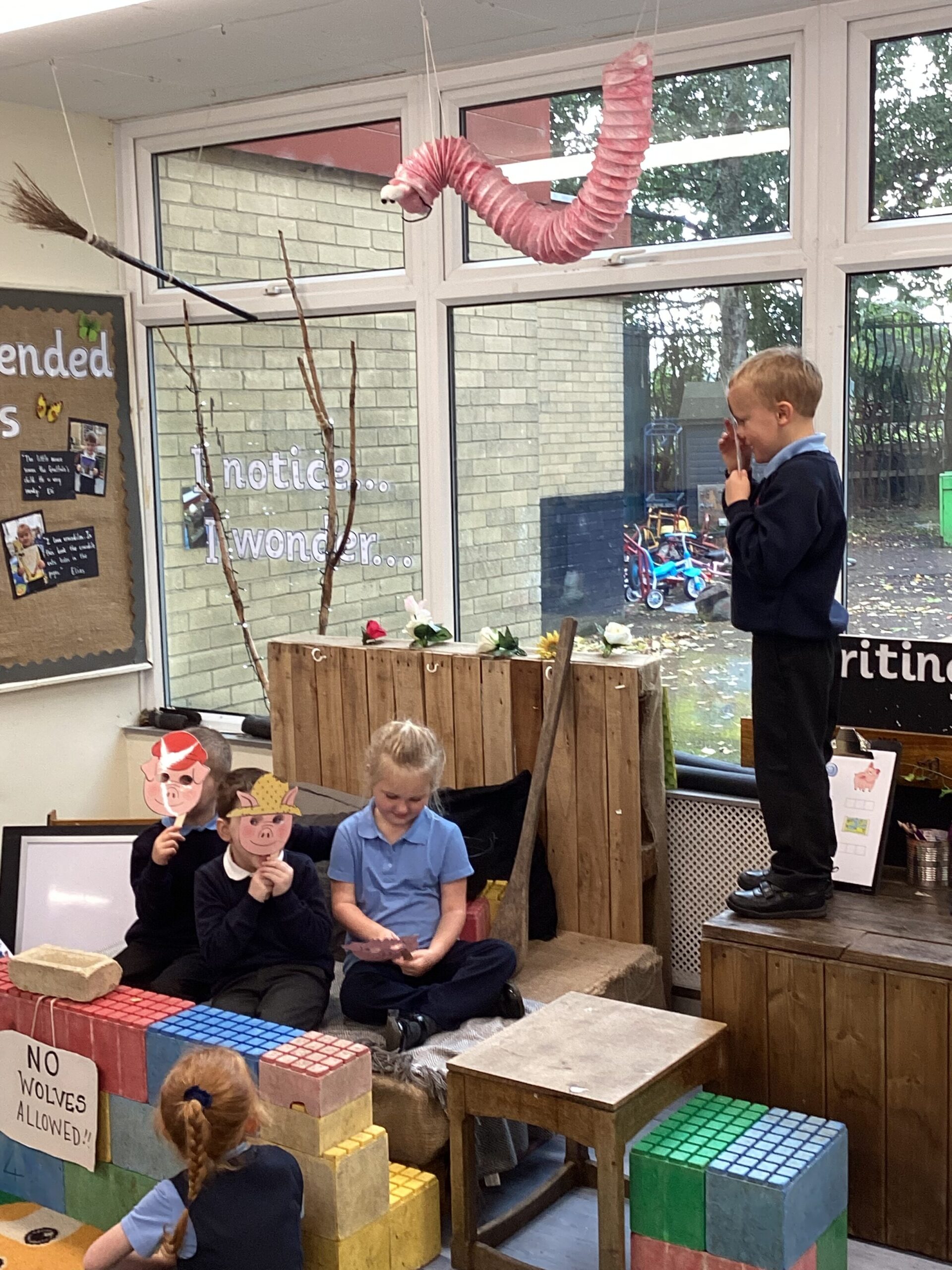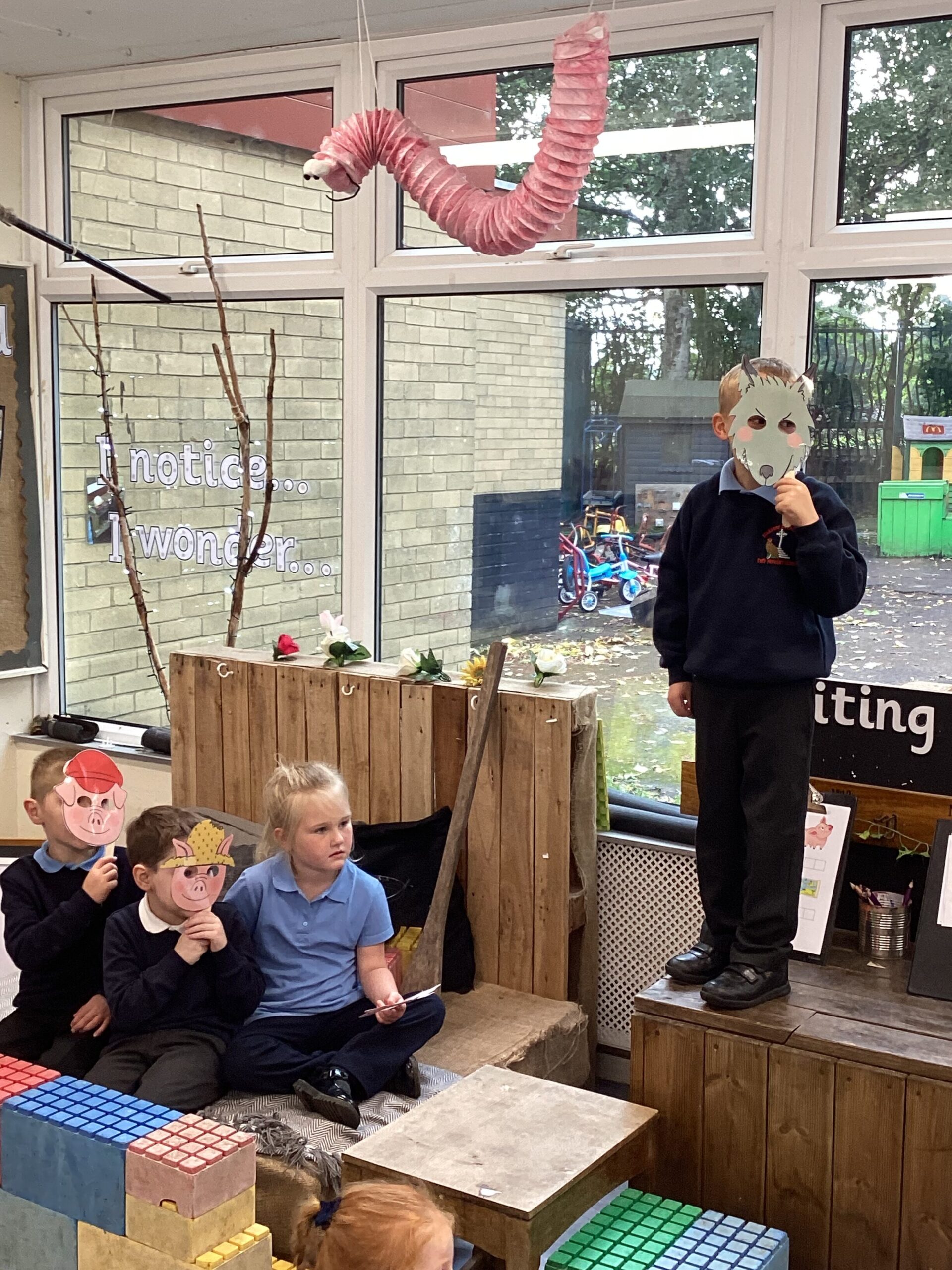 The Three Little Pigs – Each half-term the Amethyst children study a traditional tale. This half-term the children have been learning the story of The Three Little Pigs. Today the children worked co-operatively to retell the story whilst some volunteers played the role of the characters.