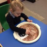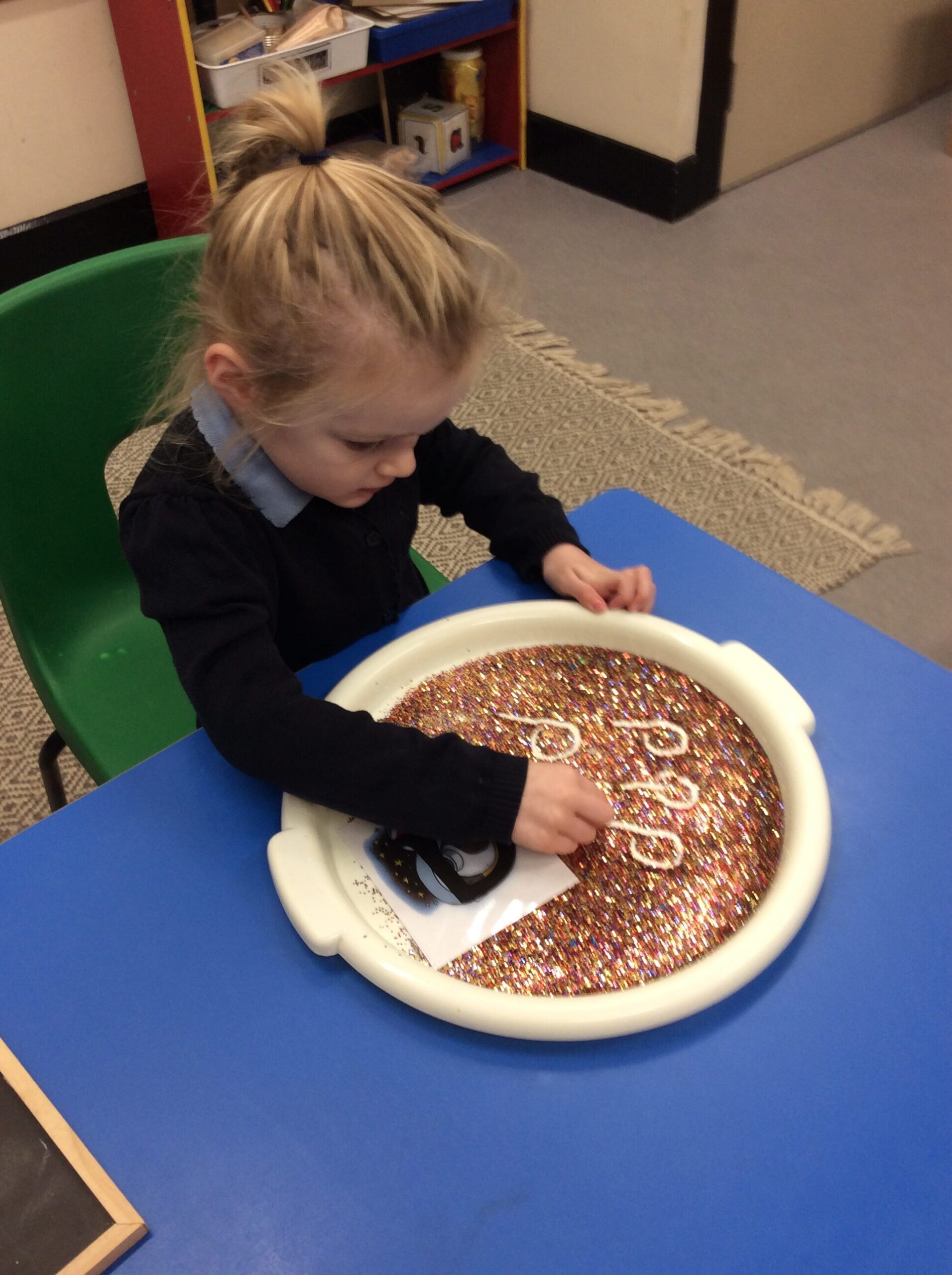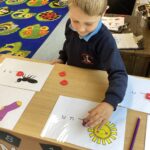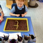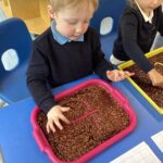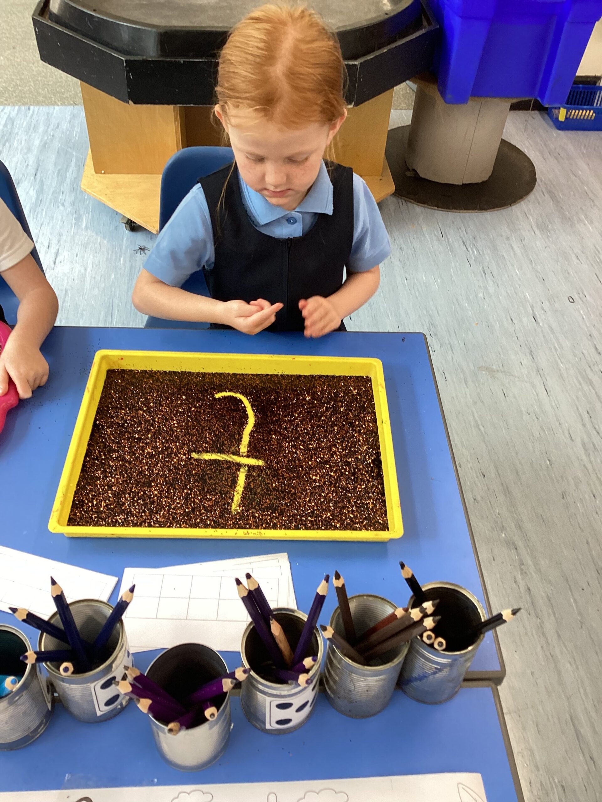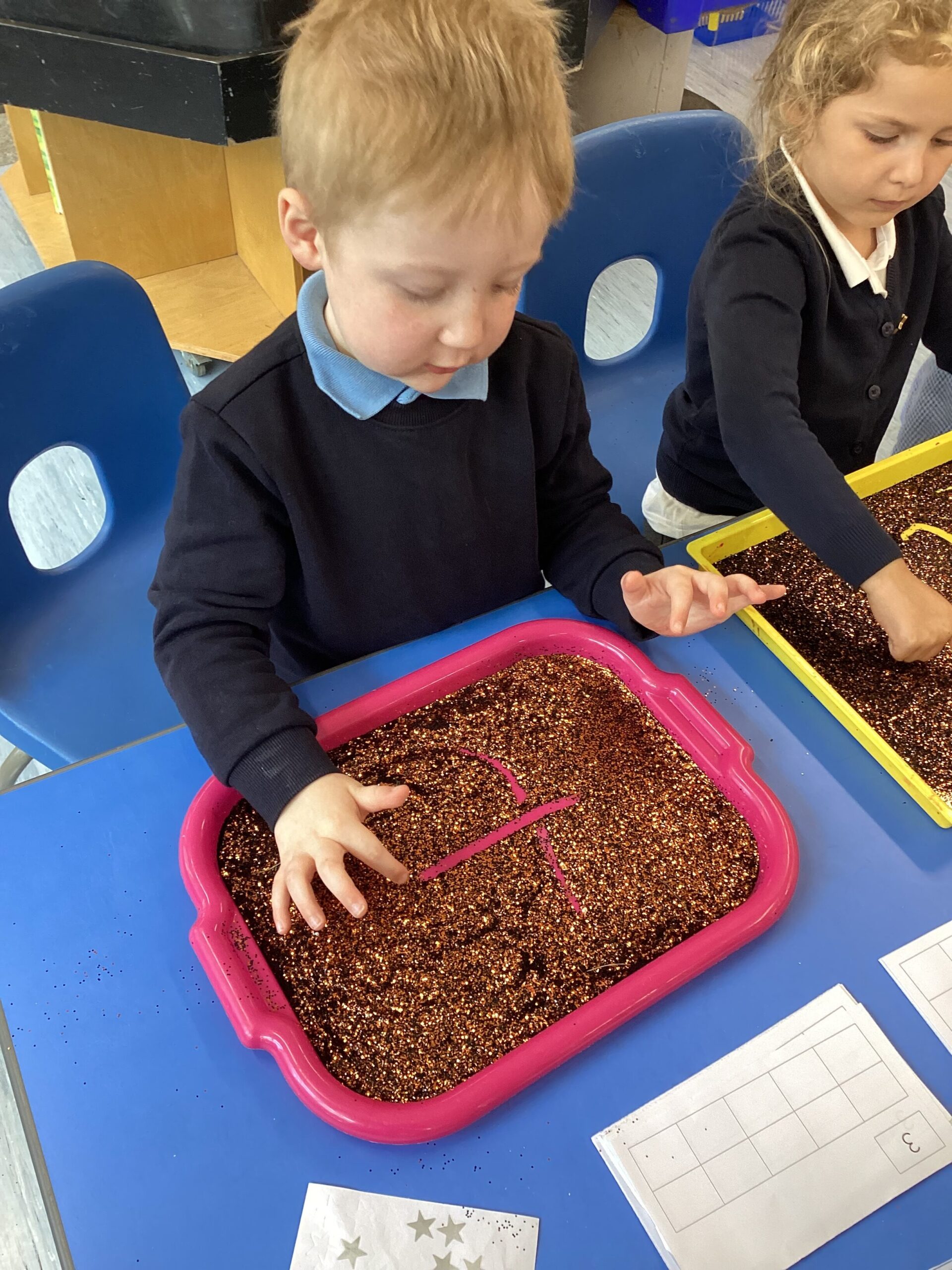 Forming graphemes – As the new school year begins, the Amethyst Reception children have been busy starting Phonics. The children had excellent phoneme recognition from their time in Opal and are now mastering their formation of the graphemes. The children are expected to write the grapheme in their books and are then challenged to replicate the learning in the linked provision as shown in the pictures below.