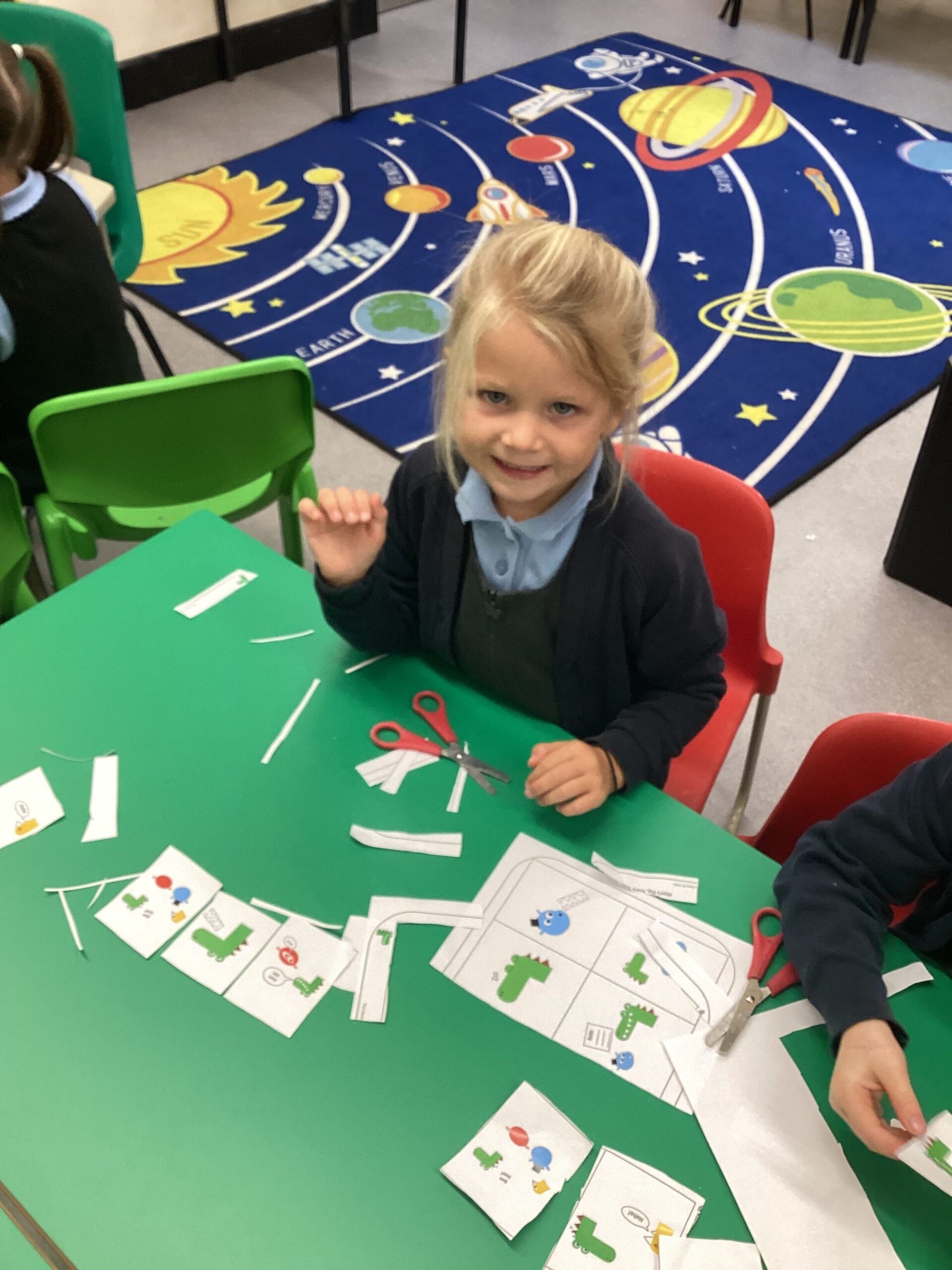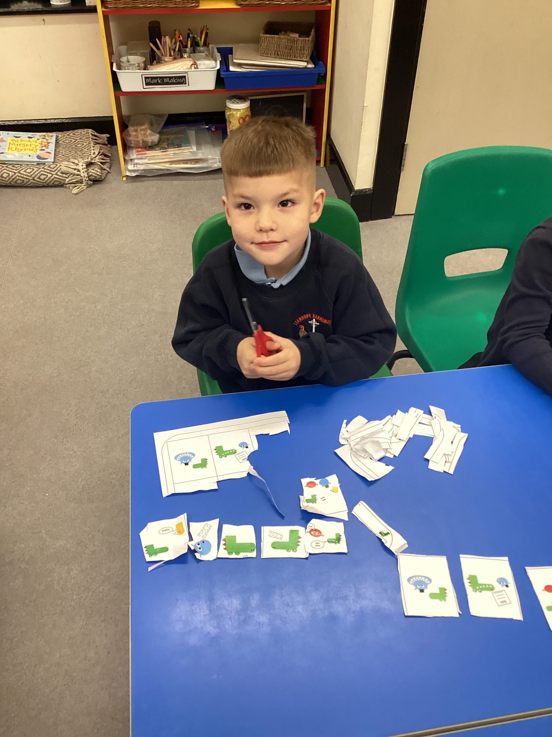 Alan’s Big Scary Teeth – This half-term the children have been unpicking the story ‘Alan’s Big Scary Teeth’. The children have been challenged to retell the story and will be writing this independently in the coming weeks. During this session the children were asked to sequence the story, and then use sentence openers to retell it to a peer.