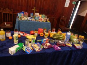 The younger children sang The Wheels on the Tractor, Xavier read a poem followed by Rev. Claire and Rev. Bruce making a Harvest rainbow which was full of all the foods people have generously given to the Food Bank.
