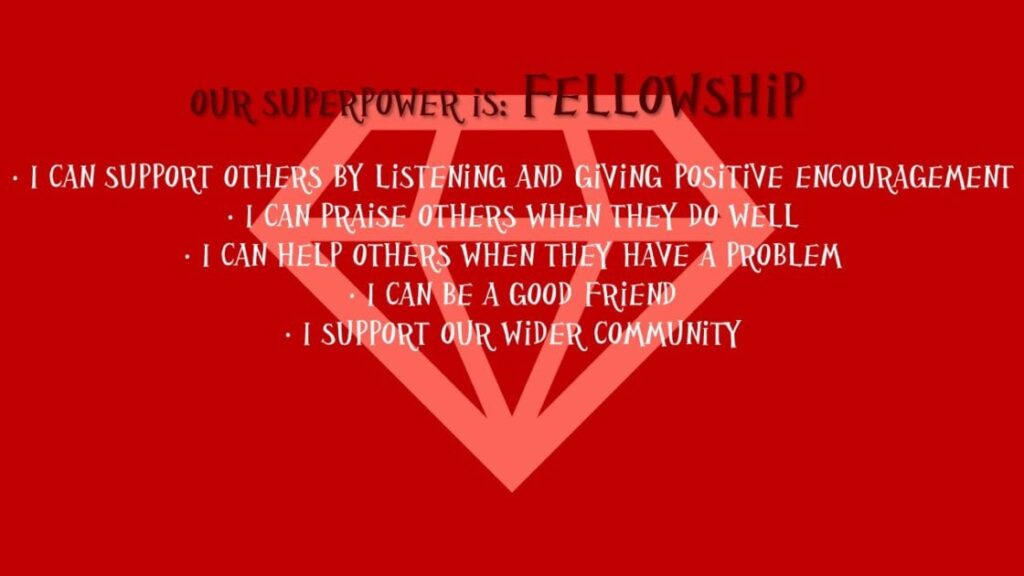 In the Ruby Learning Zone. our superpower is Fellowship. At the beginning of the year we all wrote down how we could show fellowship throughout the year whilst in school. We discussed what fellowship is and talked about the ways we can support others by listening and giving positive encouragement, helping others when they have a problem and being a good friend both in and out of the classroom.